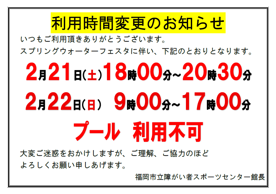 ご登録団体さまへ令和8年度の専用利用について説明会資料は 下記データよりダウンロードいただき、ご一読ください。 受付窓口にても配布しております。 ≪施設利用に関してのお問い合わせ≫ メール : sunsun_senyou@nonohana.or.jp FAX : 092-552-3447 令和8年度専用利用について令和7年11月6日 更新 |